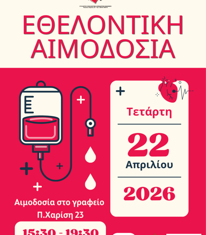 Την Τετάρτη 22 Απριλίου 2026, από τις 15:30 έως τις 19:30, στο γραφείο του συλλόγου μας (Π. Χαρίση 23), δίνουμε όλοι μαζί ένα ραντεβού ζωής. Η αιμοδοσία πραγματοποιείται σε συνεργασία με τον Σύλλογο Εθελοντών…