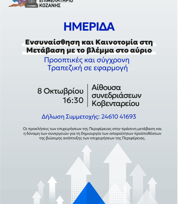 Η CrediaBank, στο πλαίσιο της δέσμευσης της στη βιώσιμη επιχειρηματικότητα, στηρίζει την Ημερίδα που διοργανώνει το Εμπορικό & Βιομηχανικό Επιμελητήριο Κοζάνης, με θέμα «Ενσυναίσθηση και Καινοτομία στη Μετάβαση με το βλέμμα στο αύριο: Προοπτικές…