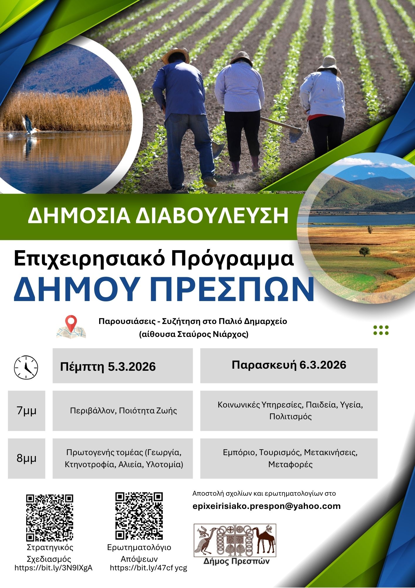Ο Δήμος Πρεσπών θέτει σε δημόσια διαβούλευση μέχρι τις 15 Μαρτίου το κείμενο του Σχεδίου Στρατηγικού Σχεδιασμού που αφορά την Α΄ Φάση του Επιχειρησιακού Προγράμματος 2024-2028 και καλεί τους πολίτες, τους κοινωνικούς και οικονομικούς φορείς να συμμετάσχουν ενεργά σε έναν ουσιαστικό διάλογο για τους στόχους, τις αναπτυξιακές προτεραιότητες και τη στρατηγική του Δήμου για τα επόμενα χρόνια.