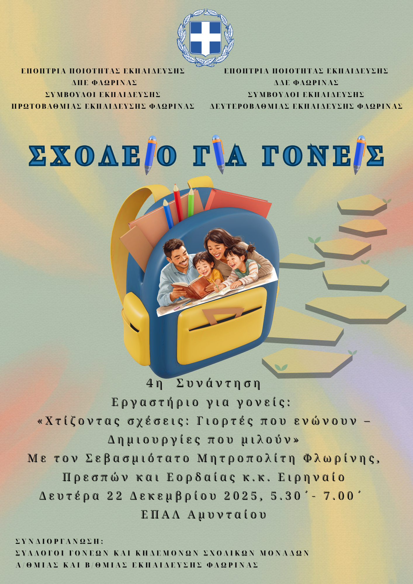 Με ένα ζεστό, γιορτινό και βιωματικό εργαστήριο ξεκινά το Σχολείο για Γονείς στο Αμύνταιο, τη Δευτέρα 22 Δεκεμβρίου 2025, σηματοδοτώντας την αρχή μιας σειράς συναντήσεων που θα υλοποιηθούν καθ’ όλη τη διάρκεια της χρονιάς.