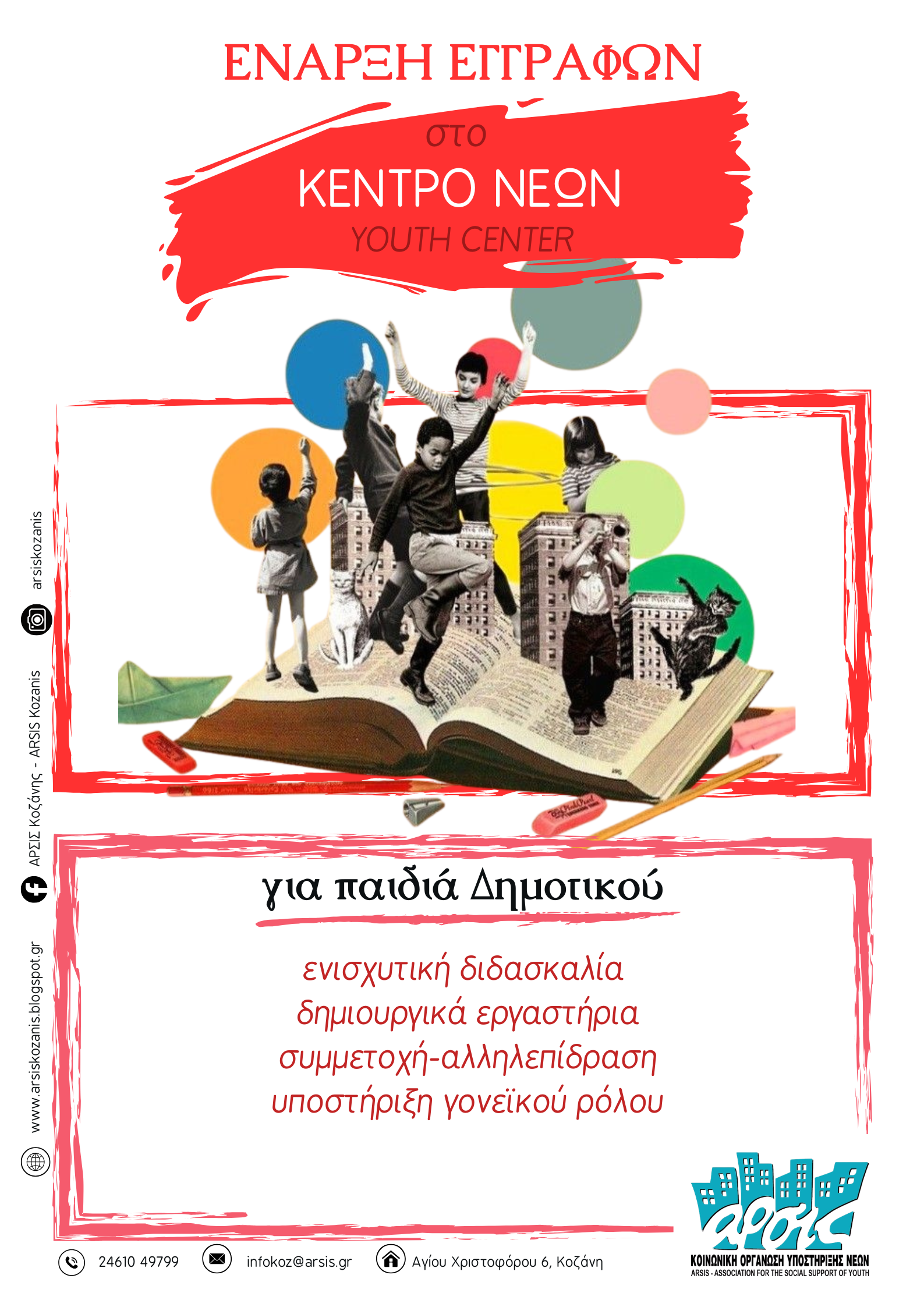 Η ΑΡΣΙΣ Κοζάνης ανακοινώνει με ιδιαίτερη χαρά ότι το Ελεύθερο Σχολείο της, που στήριξε για τόσα χρόνια παιδιά και οικογένειες της περιοχής μας, μεγαλώνει, αλλάζει και εξελίσσεται σε ένα σύγχρονο Κέντρο Νέων – Youth Center. Στηριζόμενο στις αξίες της κοινότητας και στις αρχές του εθελοντισμού σχεδιάσαμε πάνω σε νέες ιδέες υποστήριξης, ανάπτυξης δεξιοτήτων και συμπερίληψης για όλα τα παιδιά, χωρίς διακρίσεις και αποκλεισμούς.