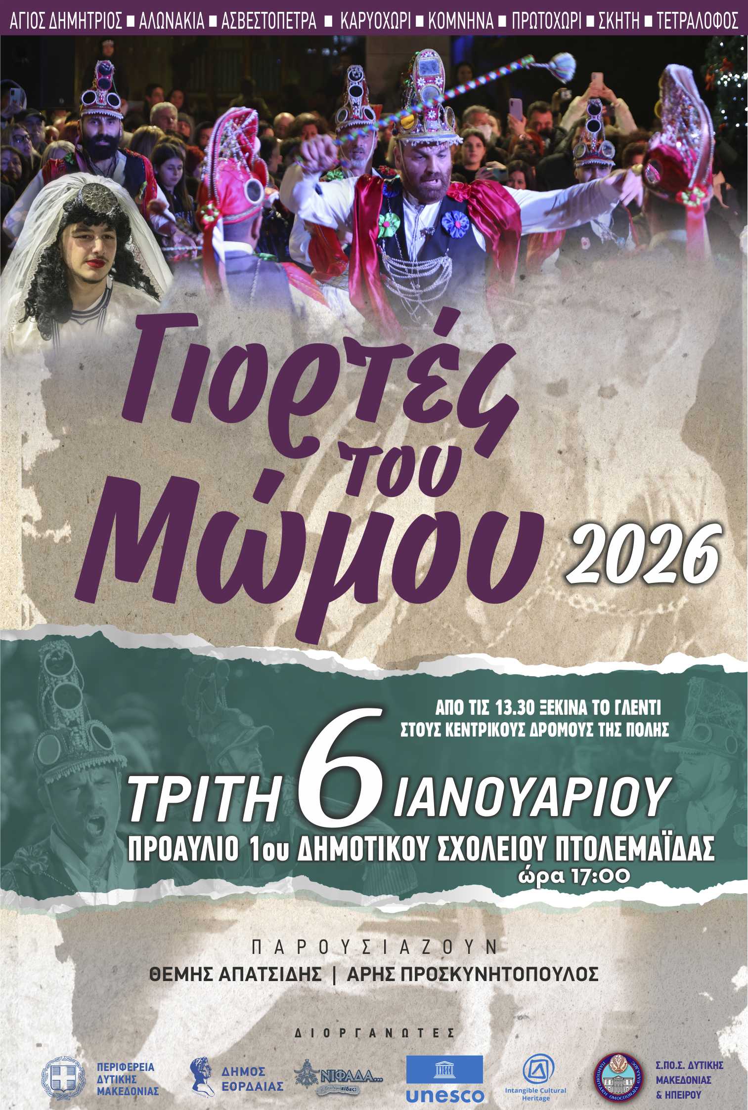 Η γιορτή των Μωμόγερων ξεκινά την Τρίτη 6 Ιανουαρίου 2026 (Θεοφάνεια) στις 13:30, δίνοντας ρυθμό από νωρίς και μεταφέροντας το γλέντι στους κεντρικούς δρόμους της πόλης. Η κορύφωση της εκδήλωσης θα πραγματοποιηθεί στις 17:00, στο προαύλιο του 1ου Δημοτικού Σχολείου Πτολεμαΐδας.