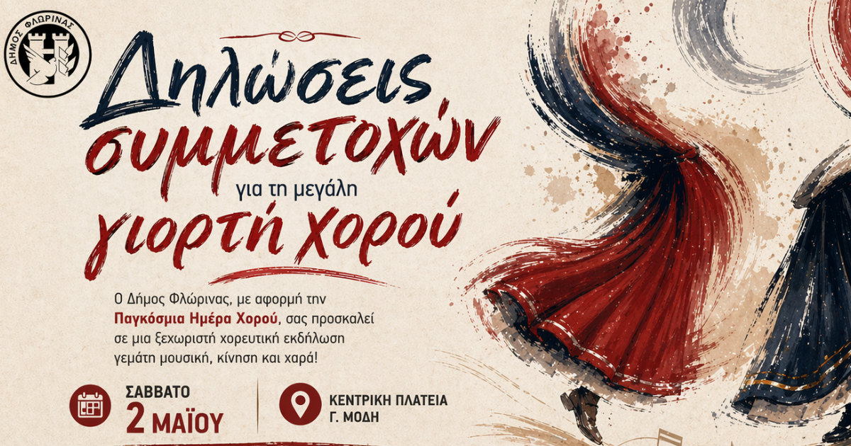 Ο Δήμος Φλώρινας, με αφορμή την Παγκόσμια Ημέρα Χορού, σας προσκαλεί σε μια ξεχωριστή χορευτική εκδήλωση γεμάτη μουσική, κίνηση και χαρά το Σάββατο 2 Μαΐου στην κεντρική πλατεία Γ. Μόδη.