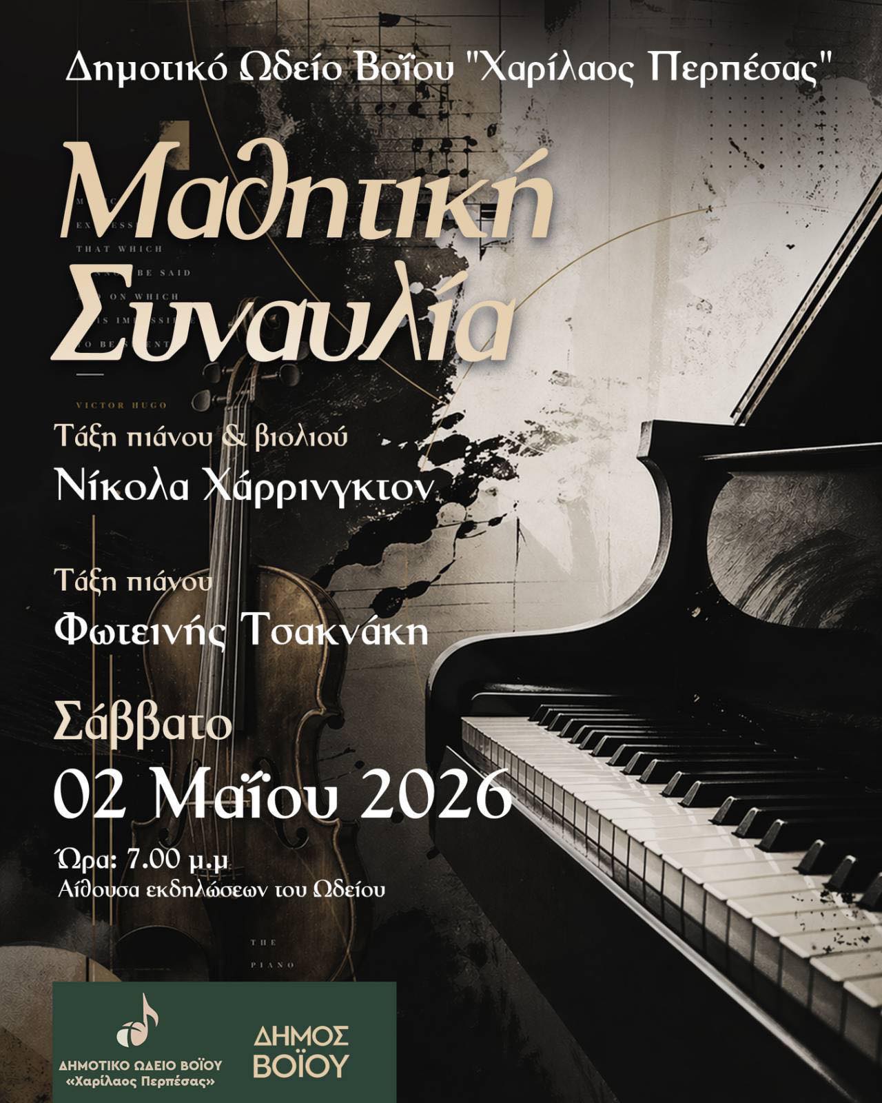 Categories Ενημέρωση Δημοτικό ωδείο Βοΐου “Χαρίλαος Περπέσας” Μαθητική συναυλία by West Channel Posted on 30 Απριλίου, 2026 30 Απριλίου, 2026 Οι μαθητές των τάξεων: Πιάνου & Βιολιού της Νίκολα Χάρρινγκτον Πιάνου της Φωτεινής Τσακνάκη σας προσκαλούν σε μια ξεχωριστή μουσική βραδιά γεμάτη μελωδίες! Αίθουσα Εκδηλώσεων Ωδείου Σάββατο 2 Μαΐου Ώρα: 19:00 Previous Post Σταύρος Παπασωτηρίου: Επαναλειτουργία της σιδηροδρομικής γραμμής Φλώρινας – Θεσσαλονίκης. Next Post Κάλεσμα συμμετοχής σε ανοιχτή εθελοντική αιμοδοσία Σχετικά άρθρα Categories Διάφορα Ενημέρωση Κοζάνη Τσιούμαρης & ‘Αμπας στην Οικονομικη Επιτροπή της Περιφέρειας για το Μέλι – Δείτε το Βίντεο Categories Ενημέρωση Προτρέπουμε την κα Διαμαντοπούλου να μας εξηγήσει πως εννοεί την σύμπραξη του Ιδιωτικού Τομέα