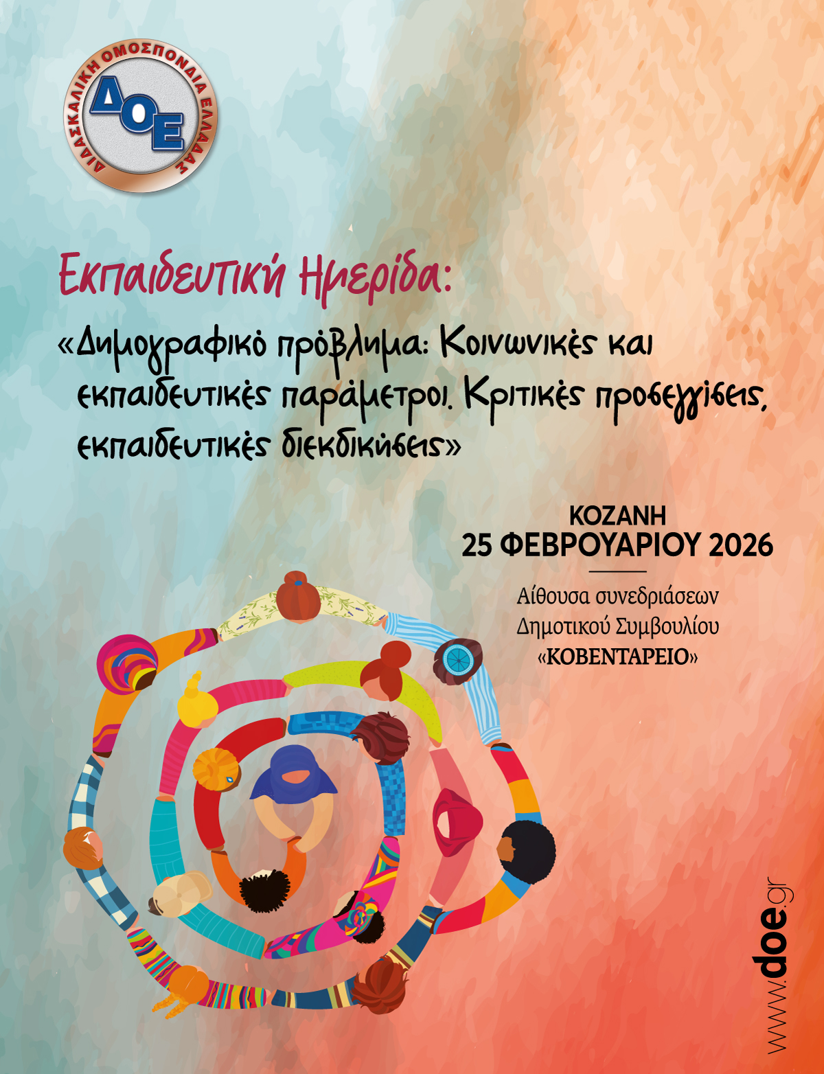 Το Δ.Σ. της Δ.Ο.Ε. σε συνεργασία με τον Σύλλογο Εκπαιδευτικών Π.Ε. Κοζάνης, διοργανώνουν επιστημονική ημερίδα με θέμα: «Δημογραφικό πρόβλημα: Κοινωνικές και εκπαιδευτικές παράμετροι. Κριτικές προσεγγίσεις, εκπαιδευτικές διεκδικήσεις», την Τετάρτη 25 Φεβρουαρίου 2026, ώρα 9.00–15.00 στην αίθουσα συνεδριάσεων Δημοτικού Συμβουλίου Κοζάνης Κοβεντάρειο.