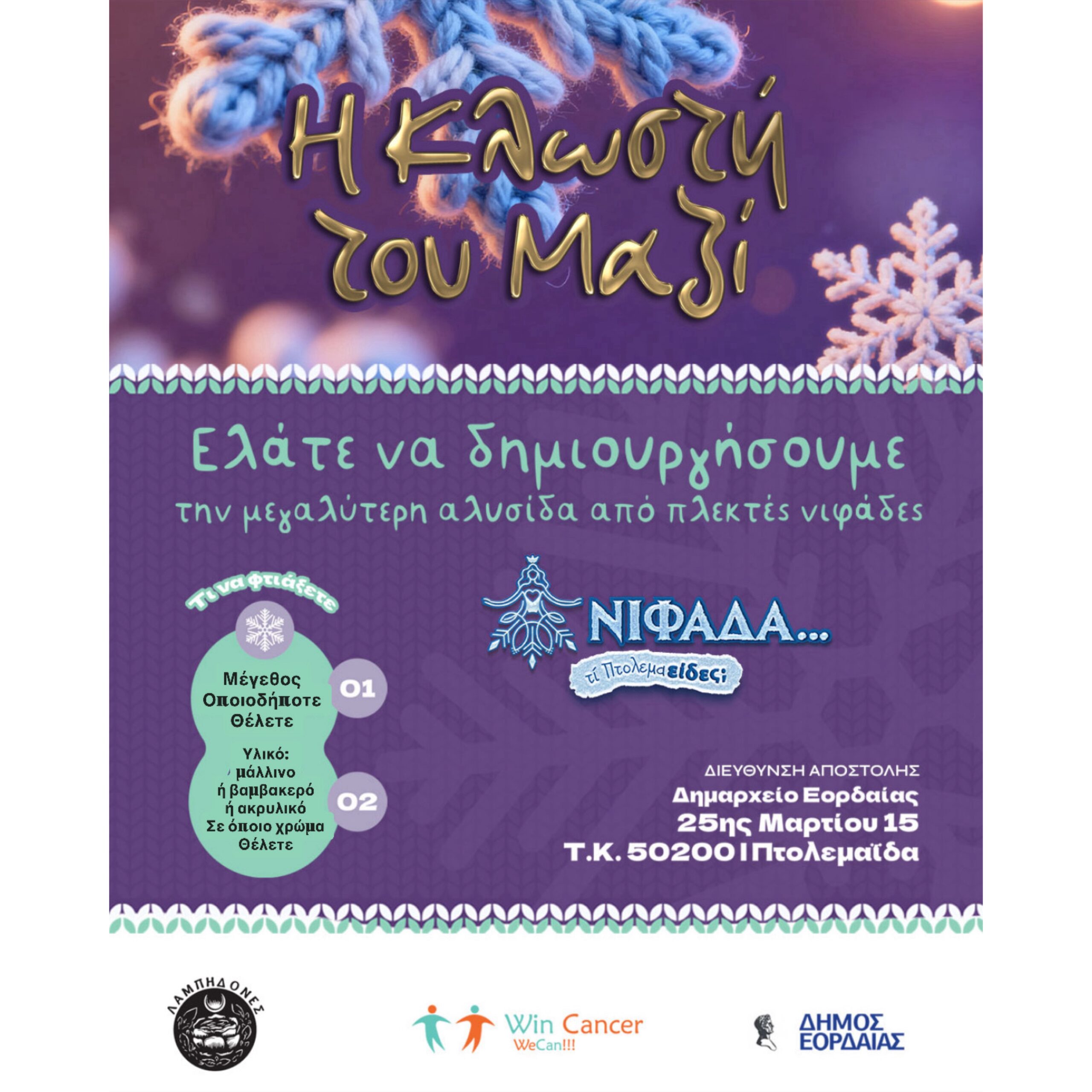 Οι νιφάδες μπορούν να αποστέλλονται έως τις 30 Νοεμβρίου 2026 στη διεύθυνση: Δημαρχείο Εορδαίας 25ης Μαρτίου 15 Τ.Κ. 50200 Πτολεμαΐδα
