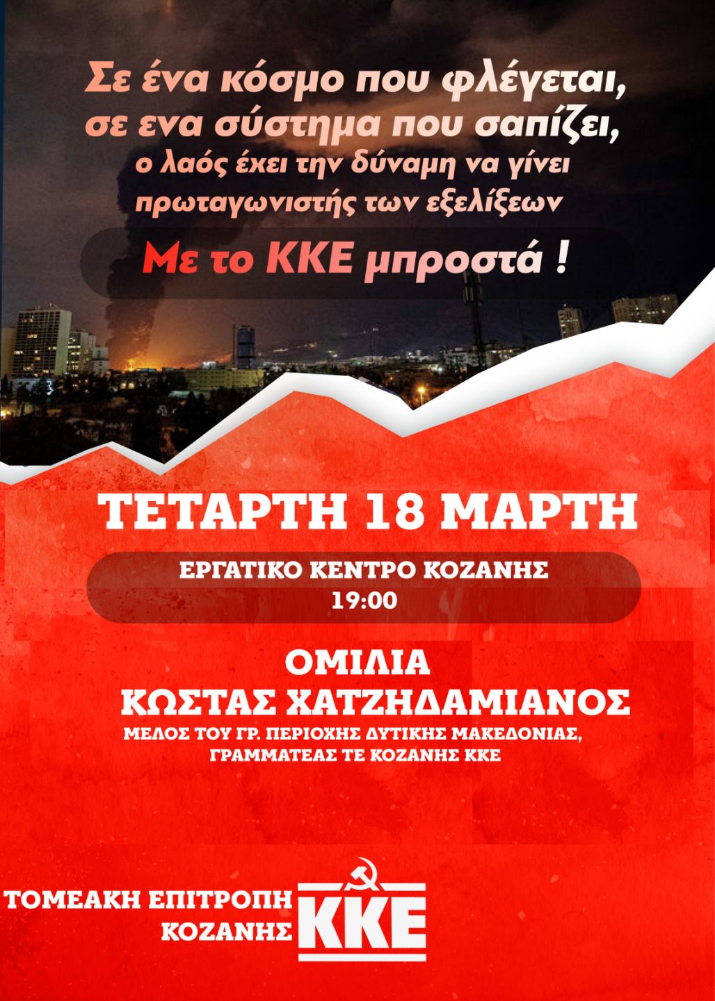 Τετάρτη 18 Μαρτίου 7μμ Εργατικό Κέντρο Κοζάνης – Θα μιλήσει ο Κώστας Χατζηδαμιανός Γραμματέας Τομεακής Επιτροπής Κοζάνης του ΚΚΕ.