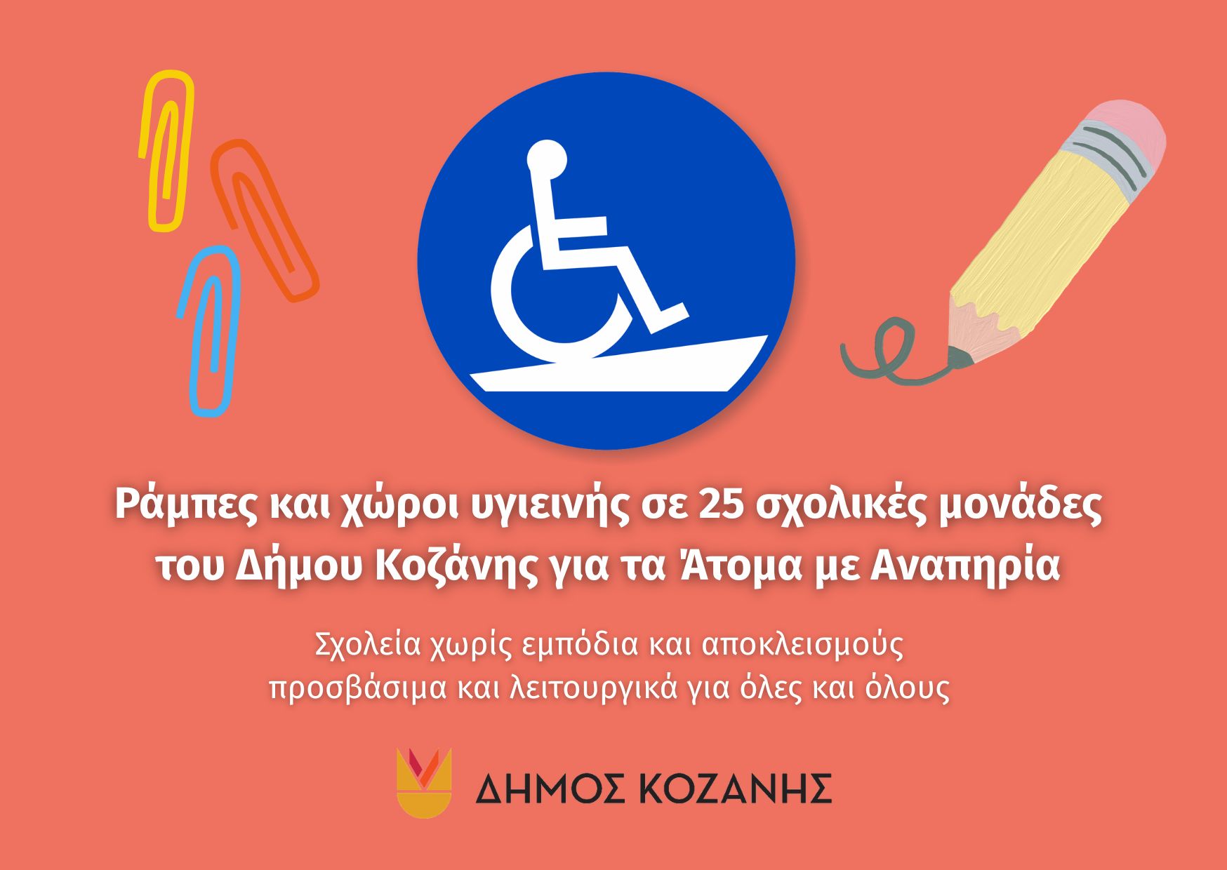 Ράμπες και χώροι υγιεινής σε 25 σχολικές μονάδες του Δήμου Κοζάνης για τα Άτομα με Αναπηρία – «Στόχος μας είναι σχολεία χωρίς εμπόδια και αποκλεισμούς, προσβάσιμα και λειτουργικά για όλες και όλους», τονίζει ο Δήμαρχος Κοζάνης Γιάννης Κοκκαλιάρης