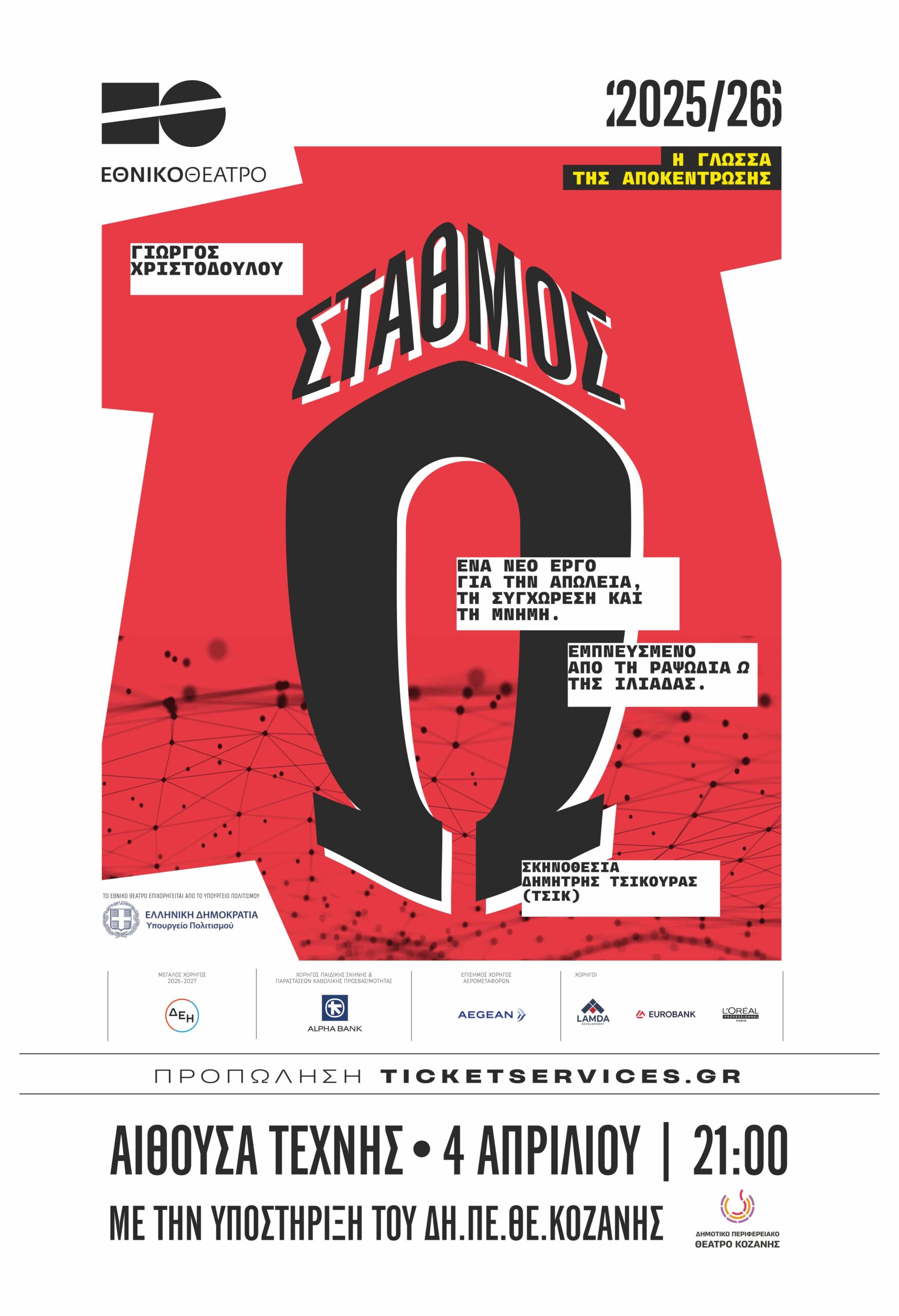 Το Δημοτικό Περιφερειακό Θέατρο Κοζάνης φιλοξενεί για πρώτη φορά το Εθνικό Θέατρο με την παράσταση Σταθμός Ω: ένα νέο ελληνικό θεατρικό έργο του Γιώργου Χριστοδούλου, σε σκηνοθεσία του Δημήτρη Τσικούρα (Τσικ), αριστούχου αποφοίτου του Τμήματος Σκηνοθεσίας της Δραματικής Σχολής του Εθνικού Θεάτρου για την περσινή ακαδημαϊκή χρονιά.