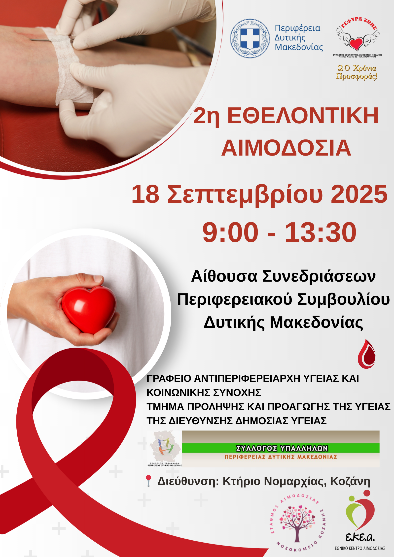 Το Γραφείο Αντιπεριφερειάρχη Δημόσιας Υγείας & Κοινωνικής Συνοχής σε συνεργασία με το Τμήμα Πρόληψης και Προαγωγής της Υγείας Δημόσιας Υγείας, το Σύλλογο υπαλλήλων Περιφέρειας Δυτικής Μακεδονίας και το Σύλλογο εθελοντών αιμοδοτών Κοζάνης «Γέφυρα Ζωής»