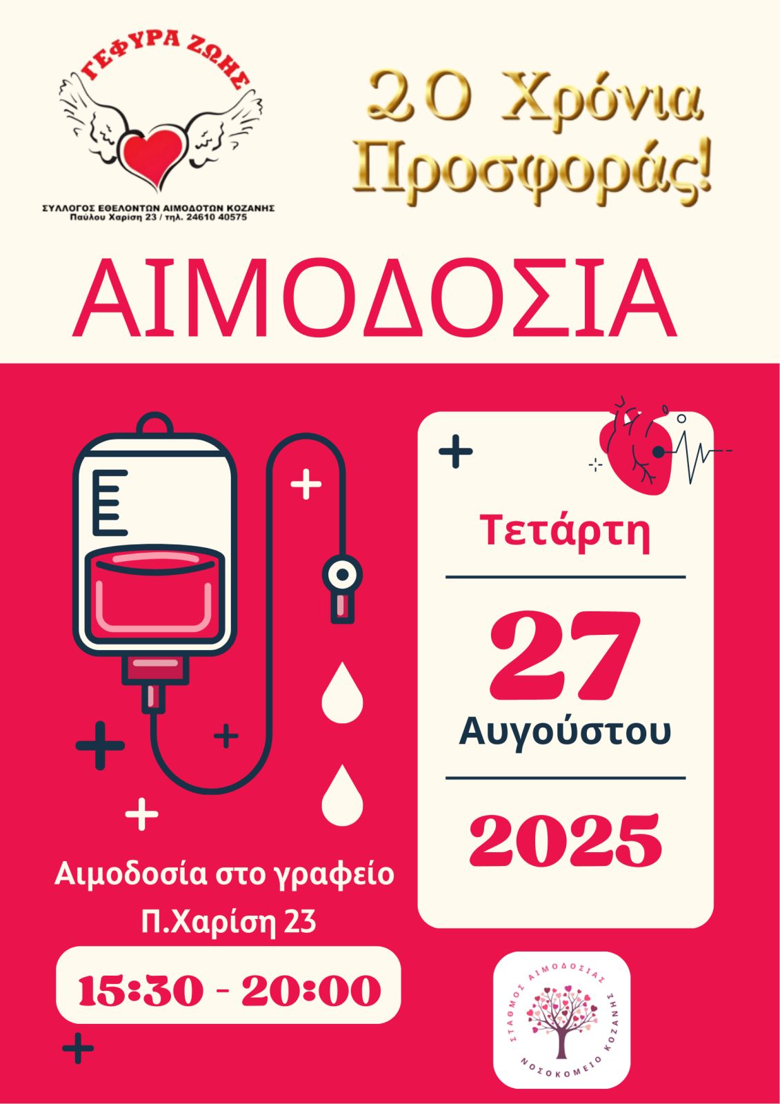 Μετά από ένα δύσκολο καλοκαίρι, που εξάντλησε τα αποθέματα αίματος στα νοσοκομεία, Αιμοδοσία ξανά την Τετάρτη 27 Αυγούστου 2025 από τις 15:30 – 20:00, (προσέλευση μέχρι 19:30) στο γραφείο του Συλλόγου, Π. Χαρίση 23 με το τμ. Αιμοδοσίας του «Μαμάτσειου» Γ.Ν. Κοζάνης. Οι ανάγκες σε μεταγγίσεις είναι διαρκείς, καθημερινές, 365 μέρες το χρόνο.