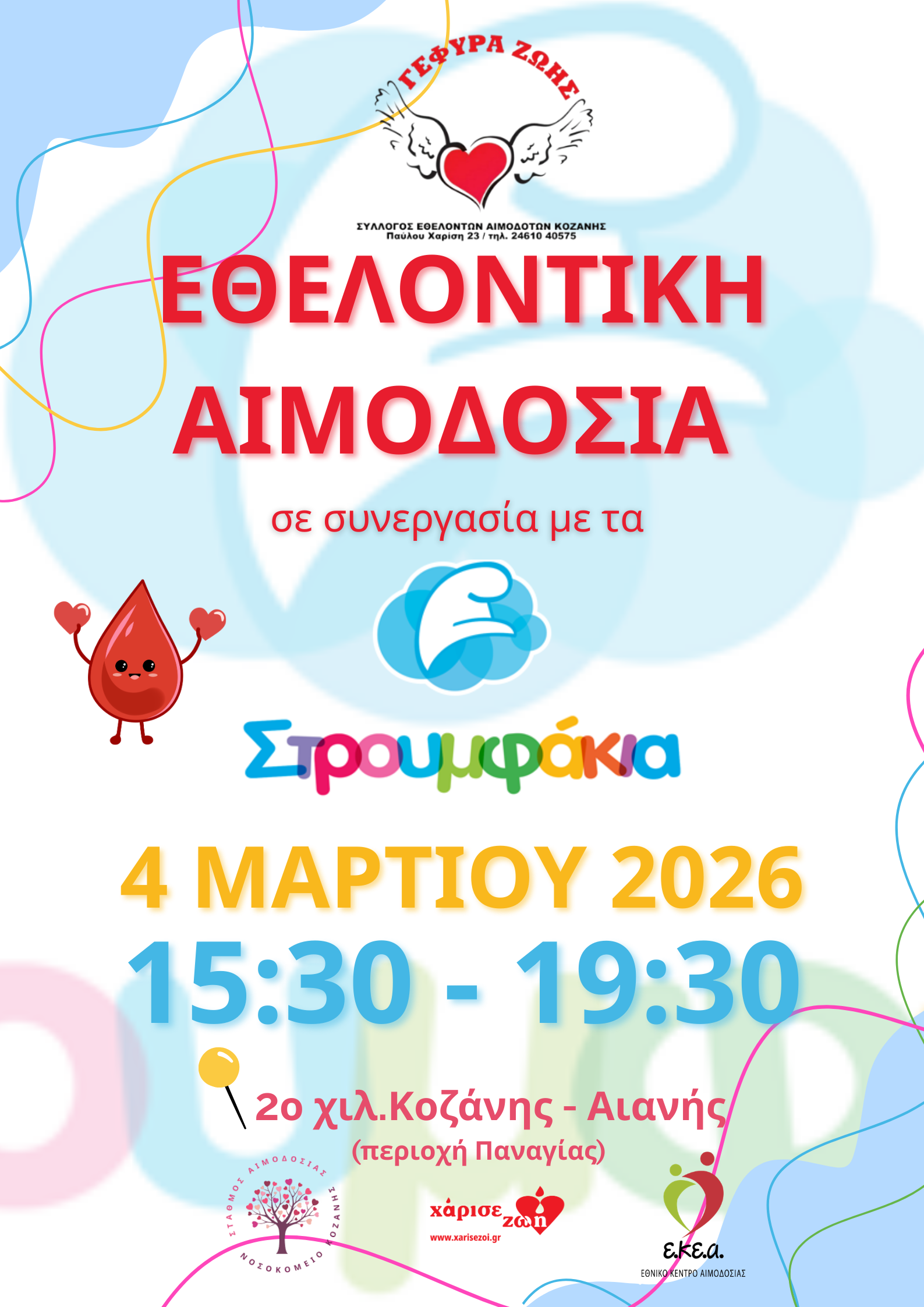 Την Τετάρτη 4 Μαρτίου 2026, από τις 15:30 έως τις 19:30, σας καλούμε να συμμετάσχετε στην εθελοντική αιμοδοσία που πραγματοποιείται σε συνεργασία με τον Παιδικό Σταθμό – Νηπιαγωγείο «Στρουμφάκια», στο 2ο χλμ. Κοζάνης–Αιανής, και με την υποστήριξη του Τμήματος Αιμοδοσίας του Μαμάτσειου Νοσοκομείου Κοζάνης.
