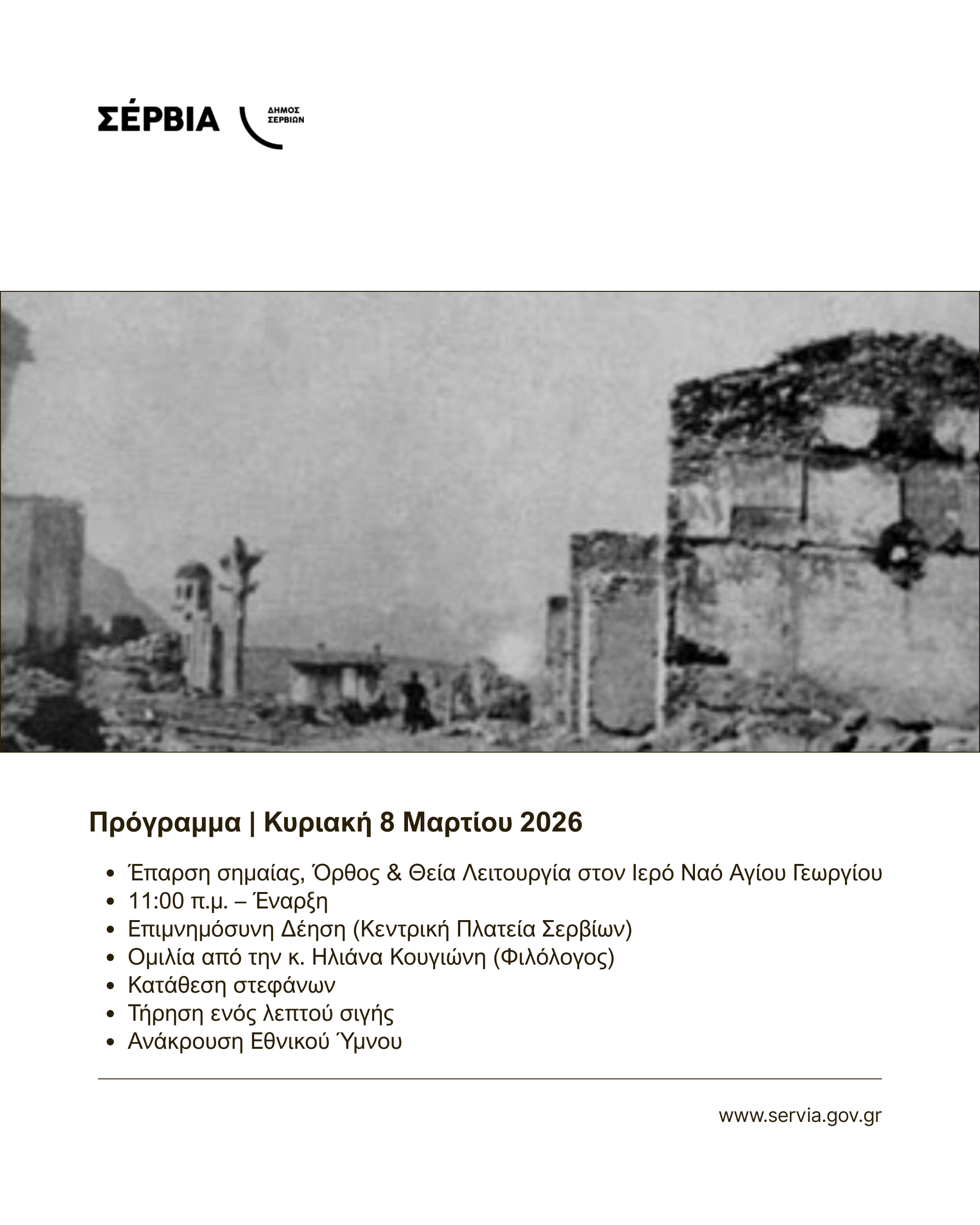 Ο Δήμαρχος Σερβίων, Χρήστος Ελευθερίου και ο Πρόεδρος της Δημοτικής Κοινότητας, Γιώργος Χρήστου σας προσκαλούν την Κυριακή 8 Μαρτίου 2026 στις εκδηλώσεις ΤΙΜΗΣ και ΜΝΗΜΗΣ της 83ης επετείου του ΟΛΟΚΑΥΤΩΜΑΤΟΣ της μαρτυρικής πόλης των Σερβίων από τα φασιστικά στρατεύματα κατοχής.