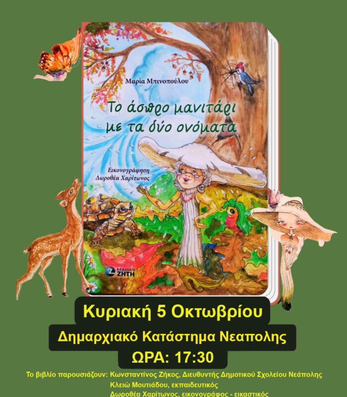Κυριακή 05 Οκτωβρίου Το Βιβλίο παρουσιάζουν: Κωνσταντίνος Ζήκος Διευθυντής του Δημοτικού Σχολείου Νεάπολης, Κλειώ Μουτιάδου Εκπαιδευτικός, Δωροθέα Χαρίτωνος Εικογράφος – Εικαστικός. Η Δρ. Μόσχου Δ. Καλλιόπη M..sc, Ph.D.,εκπαιδευτική σύμβουλος, θα μιλήσει για την επίδραση…